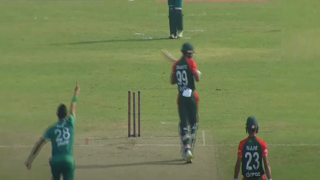 হোয়াইটওয়াশ এড়ানোর লড়াইয়ে বাংলাদেশের পক্ষে মোহাম্মদ নাঈমের সাথে ওপেন করতে নামেন নাজমুল হোসেন শান্ত। কিন্তু পাকিস্তানের পক্ষে টি-টোয়েন্টিতে আজ অভিষিক্ত ফাস্ট বোলার নাওয়াজের ১৪৫ কিলোমিটার/ঘণ্টার বলে গতিতে পরাস্ত হয়ে মাত্র ৫ রান করে প্যাভিলিয়নে ফিরেছেন এই বাঁহাতি। এখন ক্রিজে এসেছেন শামীম হোসেন।