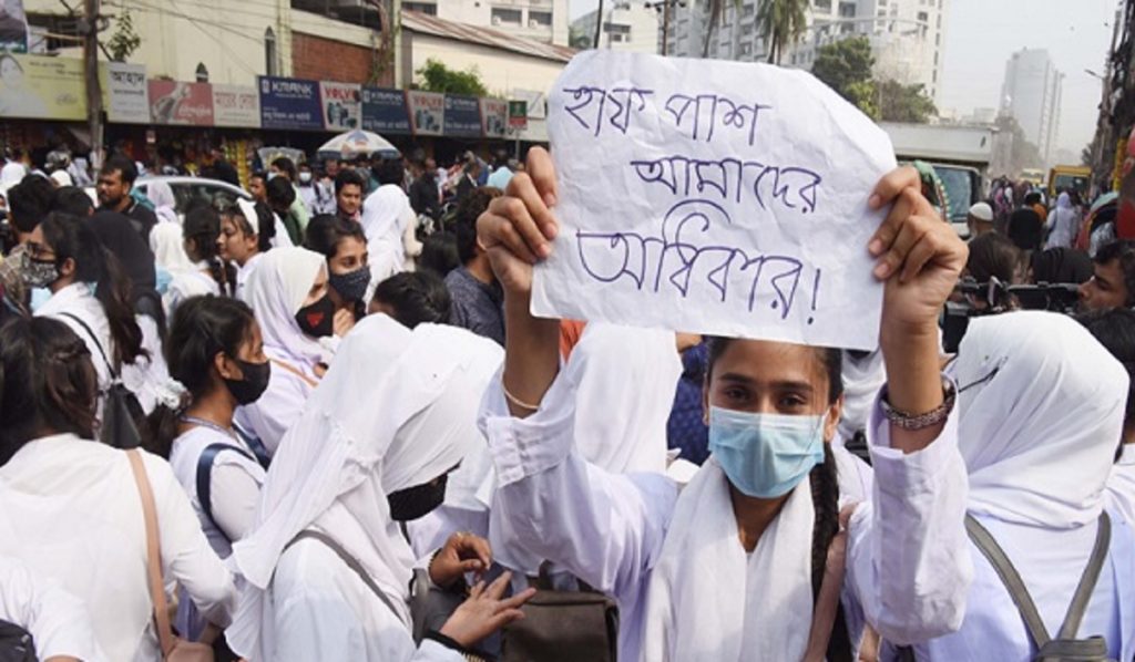 মঙ্গলবার (২৩ নভেম্বর) সকাল ১১টা থেকে বকশি বাজার মোড় অবরোধ করে সাত কলেজের শিক্ষার্থীরা বিক্ষোভ করছে। অর্ধেক ভাড়া দেয়া নিয়ে কথা কাটাকাটির জেরে গতকাল ঢাকা কলেজের এক শিক্ষার্থীর গায়ে হাত তোলে বাসের সহকারী। এর আগে, শিক্ষার্থীকে ধর্ষণের হুমকি দেয়া, বাস থেকে নামিয়ে দেয়ার মত ঘটনাও ঘটেছে।