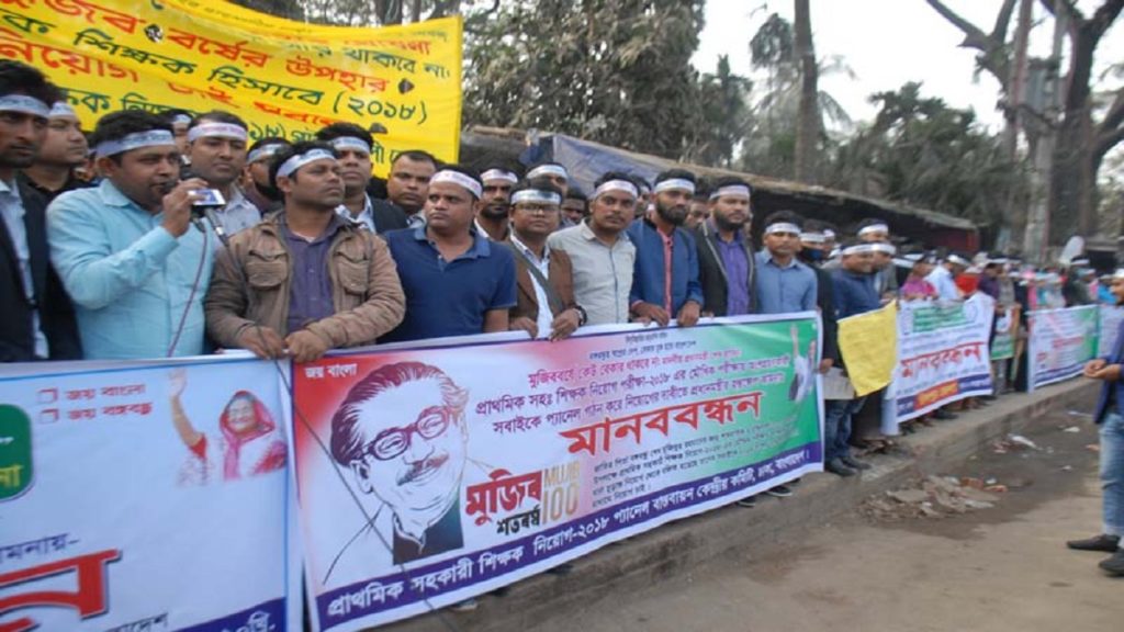 ২০১৮ সালের প্রাথমিক বিদ্যালয় শিক্ষক নিয়োগ পরীক্ষায় উত্তীর্ণ সবাইকে প্যানেল গঠন করে নিয়োগের দাবিতে মানববন্ধন করেছে চাকরিপ্রত্যাশীরা।