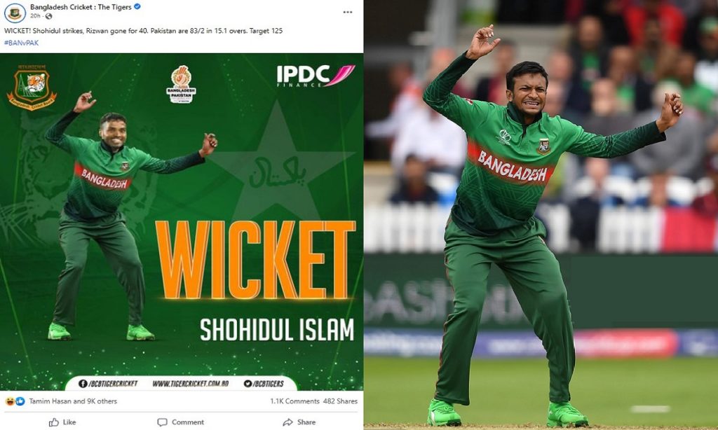 গতকাল (২২ নভেম্বর) পাকিস্তানের বিরুদ্ধে বাংলাদেশের তৃতীয় ও শেষ টি-টোয়েন্টি ম্যাচে মোহাম্মদ রিজওয়ানের উইকেট লাভ করেন বাংলাদেশের মিডিয়াম পেসার শহিদুল ইসলাম। রিজওয়ানকে বোল্ড করে নেয়া উইকেটটিই ছিল এই ম্যাচে বাংলাদেশের পক্ষে টি-টোয়েন্টিতে অভিষিক্ত পেসার শহিদুলের প্রথম উইকেট। আর এ ঘটনাতেই হয়তো নড়েচড়ে বসে বাংলাদেশ ক্রিকেট বোর্ডের মিডিয়ার দায়িত্বে থাকা কর্মকর্তারা। তাদের কাছে শহিদুলের কোনো ছবি ছিল নাকি ছিল না, তা জানা না গেলেও সাকিব আল হাসানের পুরনো একটি ছবিই যে তারা শহিদুলের ক্ষেত্রে ব্যবহার করেছে, সেটা নিশ্চিত হওয়া গেছে অনেকটাই। ২০১৯ বিশ্বকাপে ওয়েস্ট ইন্ডিজের বিপক্ষে সাকিব আল হাসানের একটি ছবি ব্যবহার করা হয় সেই পোস্টে, যেখানে জার্সিও পরিবর্তন হচ্ছে প্রতি সিরিজেই!