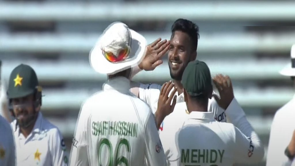 এর আগে, তাইজুল ইসলামের দুর্দান্ত বোলিংয়ে সকালের সেশনেই ম্যাচে ফিরে আসে বাংলাদেশ। আগের দিনের বিনা উইকেটে ১৪৫ রান নিয়ে খেলতে নেমে তাইজুল ও মিরাজের স্পিন ঘূর্ণিতে কুপোকাত হয় পাকিস্তান। বিশাল ওপেনিং জুটির পর আর কেউই বড় করতে পারেননি ইনিংসকে। সেদিক থেকে বাংলাদেশ ও পাকিস্তানের ইনিংস অনেকটা একইভাবে যাচ্ছে। বাংলাদেশের ৩৩০ রানের মধ্যে লিটন ও মুশফিকের জুটিতেই এসেছিল ২০৬ রান। অন্যদিকে, উদ্বোধনী জুটিতে ১৪৬ রান করে ফেলার পর নিয়মিত বিরতিতে উইকেট হারিয়ে বড় লিডের স্বপ্ন অনেকটাই ফিকে হয়ে গেছে পাকিস্তানের।