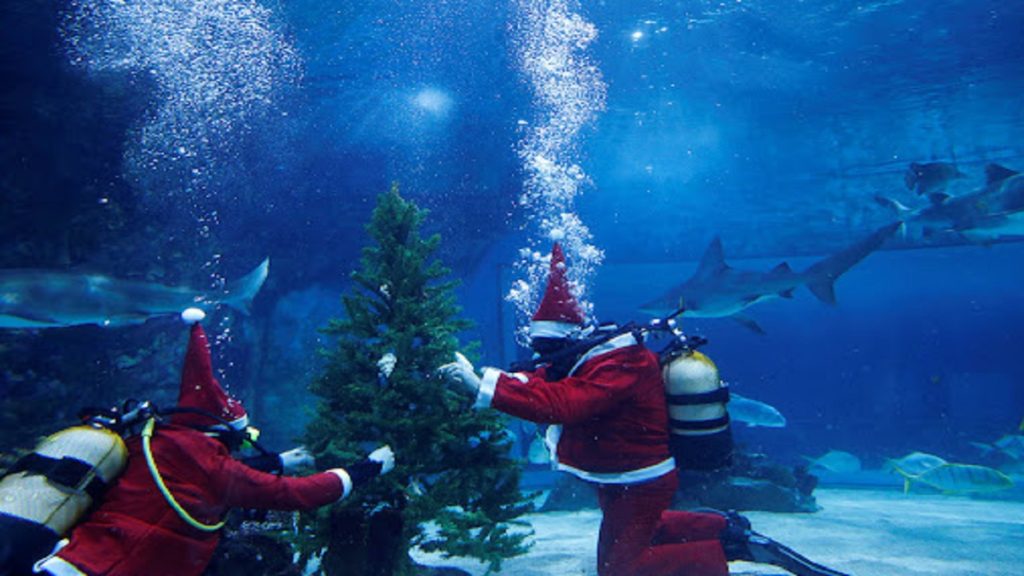 সান্তা ক্লজের সাজে সেগুলো সাজানোর কাজ করছেন দুই ডাইভার। যারা হরহামেশাই দাপিয়ে বেড়ান সাগরের তলদেশ।