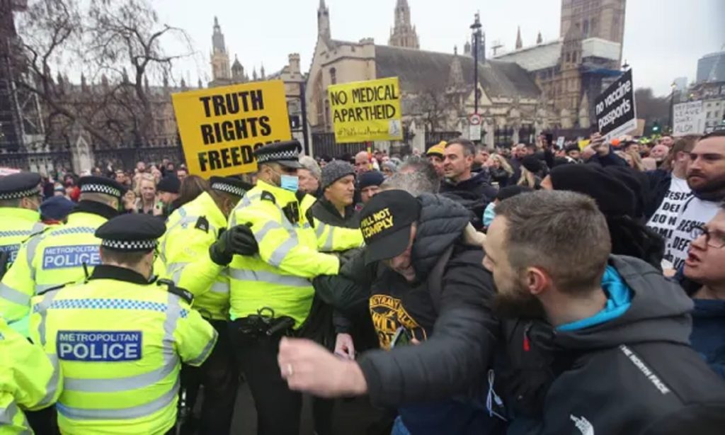 যুক্তরাজ্যে ওমিক্রন ভ্যারিয়েন্ট রোধে নতুন করে জারি করা হয়েছে কড়াকড়ি। আর এর বিরুদ্ধে ব্যাপক বিক্ষোভ শুরু হয়েছে লন্ডনে। আন্দোলনকারীদের সাথে দফায়-দফায় সংঘর্ষ বাঁধে পুলিশের।