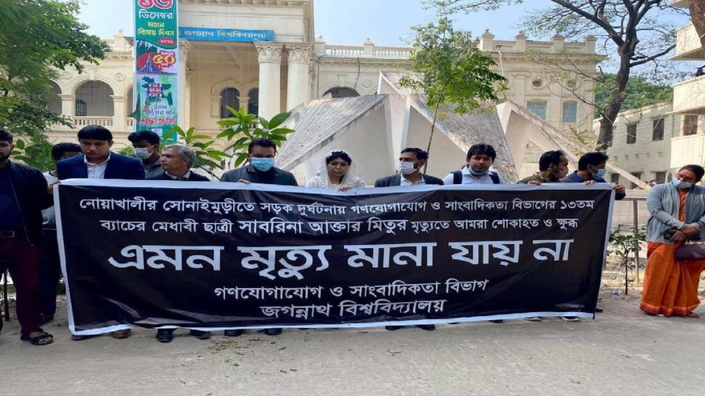 সড়ক দুর্ঘটনায় জগন্নাথ বিশ্ববিদ্যালয়ের গণযোগাযোগ ও সাংবাদিকতা বিভাগের শিক্ষার্থী সাবরিনা আক্তার মিতু নিহত হওয়ার ঘটনায় দায়ীদের বিচারের দাবিতে মানববন্ধন করেছে শিক্ষক-শিক্ষার্থীরা। রোববার (১৯ ডিসেম্বর) সকাল ১১ টায় বিশ্ববিদ্যালয়ের শহীদ মিনার প্রাঙ্গণে গণযোগাযোগ ও সাংবাদিকতা বিভাগের আয়োজনে এ মানববন্ধন করা হয়।