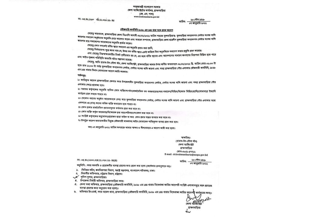 শুক্রবার (৭ জানুয়ারি) সন্ধ্যায় এ তথ্য নিশ্চিত করেছেন ব্রাহ্মণবাড়িয়া জেলা প্রশাসক হায়াত উদ-দৌলা খান।
