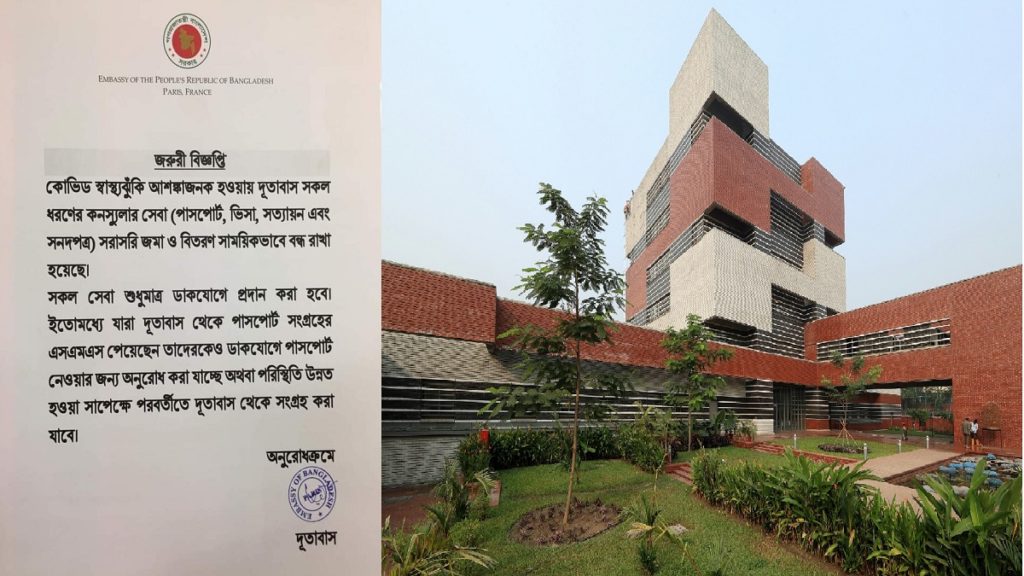বিজ্ঞপ্তিতে বলা হয়, কোভিড স্বাস্থ্যঝুঁকি আশঙ্কাজনক হওয়ায় দূতাবাস সকল ধরণের কনস্যুলার সেবা (পাসপাের্ট, ভিসা, সত্যায়ন এবং সনদপত্র) সরাসরি জমা ও বিতরণ সাময়িকভাবে বন্ধ রাখা হয়েছে। সকল সেবা শুধুমাত্র ডাকযোগে প্রদান করা হবে। ইতােমধ্যে যারা দূতাবাস থেকে পাসপাের্ট সংগ্রহের এসএমএস পেয়েছেন তাদেরকেও ডাকযােগে পাসপাের্ট নেওয়ার জন্য অনুরােধ করা যাচ্ছে অথবা পরিস্থিতি উন্নত হওয়া সাপেক্ষে পরবর্তীতে দূতাবাস থেকে সংগ্রহ করা যাবে।