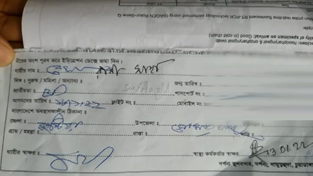 চুয়াডাঙ্গার দর্শনা চেকপোস্ট দিয়ে বৃহস্পতিবার (১৩ জানুয়ারি) দুপুরে ভারত থেকে দেশে আসেন বাংলাদেশি নাগরিক রেখা রানী সাহা। সীমান্ত পেরিয়ে চেকপোস্টে ঢুকেই স্বাস্থ্য বিভাগের হেলথ স্ক্রিনিং বুথে স্বাস্থ্য পরীক্ষার কথা ছিল তার। কিন্তু তা করা হয়নি। রেখা জানালেন, পরীক্ষা ছাড়াই করোনা পরীক্ষার নেগেটিভ সনদ ধরিয়ে দেয়া হয়েছে তাকে। বিনিময়ে নেয়া হয়েছে ১শ টাকা।