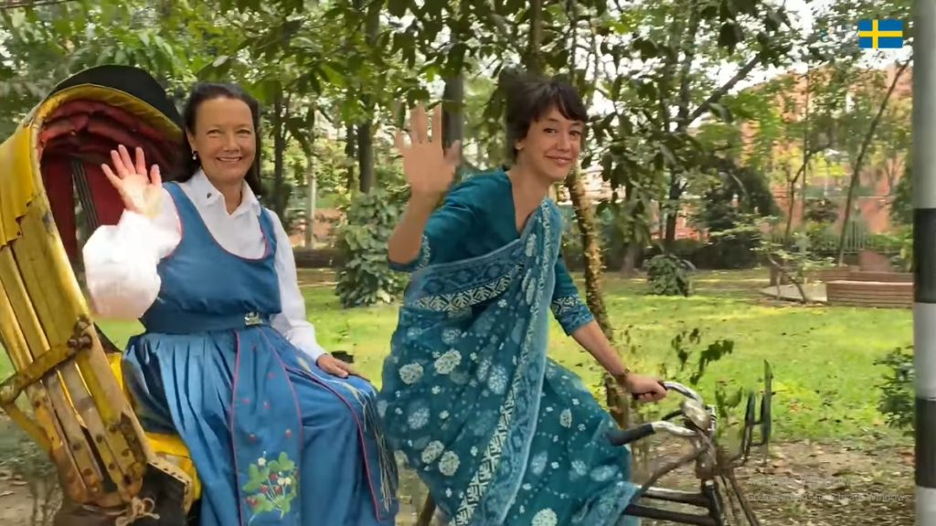 সুইডেন ও বাংলাদেশের কূটনৈতিক সম্পর্কের ৫০ বছর পূর্তিতে একটি ভিডিও প্রকাশ করেছে ঢাকাস্থ সুইডেন দূতাবাস। ভিডিওতে সুইডেনের রাষ্ট্রদূত অ্যালেক্স বার্গ ফন লিন্ডেকে শাড়ি পরে রিকশা চালাতে দেখা গেছে।