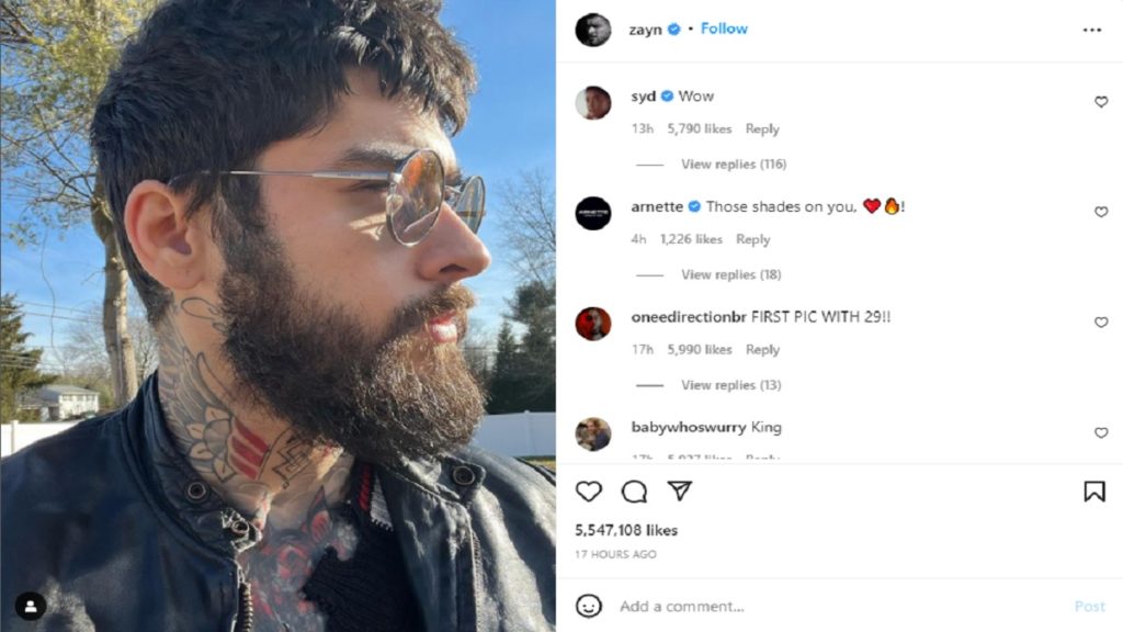 শনিবার (১৫ জানুয়ারি) ইনস্টাগ্রামে একটি সেলফি পোস্ট করেন তিনি। ২০২১ সালে ব্রিটিশ এ সঙ্গীতশিল্পীর এটিই প্রথম পোস্ট। সেলফিতে দেখা যাচ্ছে চোখে সানগ্লাস আর দাড়ি-গোঁফে মুখ ঢাকা জেনের। গায়ে পরেছেন কালো লেদার জ্যাকেট। সচরাচর এমন লুকে দেখা যায় না ওয়ান ডিরেকশনের সাবেক এ সদস্য। ছবিটি পোস্ট করার সাথে সাথে ভক্তদের মধ্যে সাড়া পড়ে যায়। ১৭ ঘণ্টায় ছবিটিতে রিঅ্যাক্ট পড়েছে ৫.৫ মিলিয়ন!