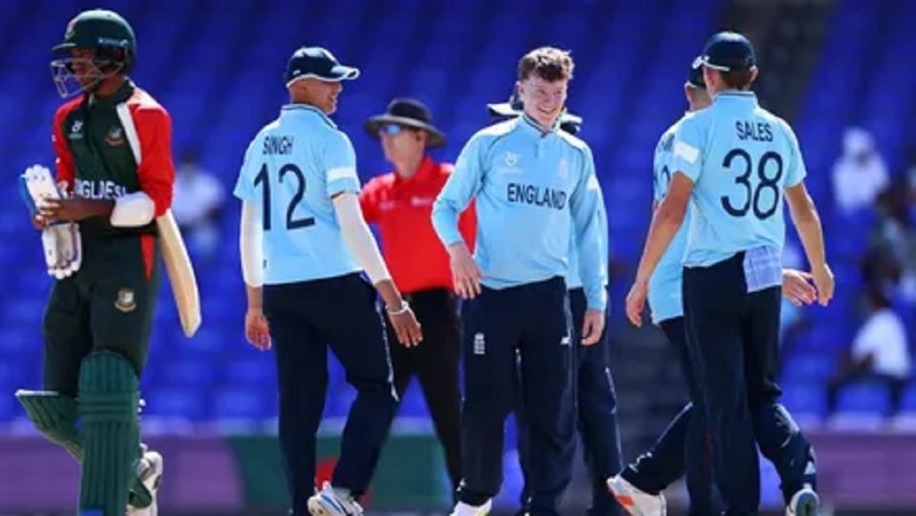 বাংলাদেশের দেয়া ৯৮ রানের লক্ষে ব্যাট করতে নেমে ১৩.২ ওভারে ২৬ রানের মাথায় ২ উইকেট হারিয়ে শুরুতে সুবিধা করতে পারেনি ইংলিশ যুবারা। তবে এর পর জ্যাকব বেথেল ও জেমস রিউ ৬৫ রানের জুটি গড়লে সহজেই জয়ের নাগাল পায় ইংল্যান্ড। বেথেল ৪৪ রানে আউট হলেও ২৬ রানে অপরাজিত থাকেন রিউ।