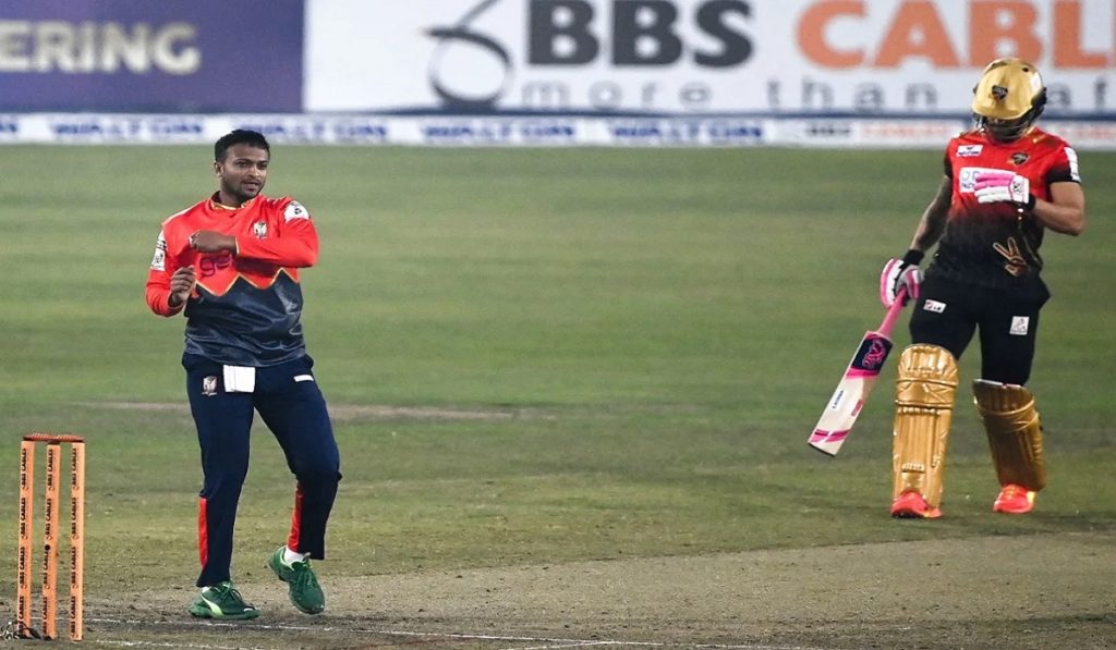 জবাবে ব্যাট করতে নেমে অফস্পিনার নাহিদুলের জোড়া আঘাতে সৈকত আলী ও সাকিব আল হাসান ফিরলে শুরুতেই ধাক্কা খায় বরিশালের ইনিংস। নাজমুল হোসেন শান্ত একপ্রান্ত আগলে রাখলেও গেইল-ব্রাভোরা দ্রুত ফিরে গেলে ম্যাচ থেকে অনেকটাই ছিটকে যায় বরিশাল। নাহিদুল ৪ ওভারে মাত্র ৫ রান খরচায় নিয়েছেন ৩ উইকেট।