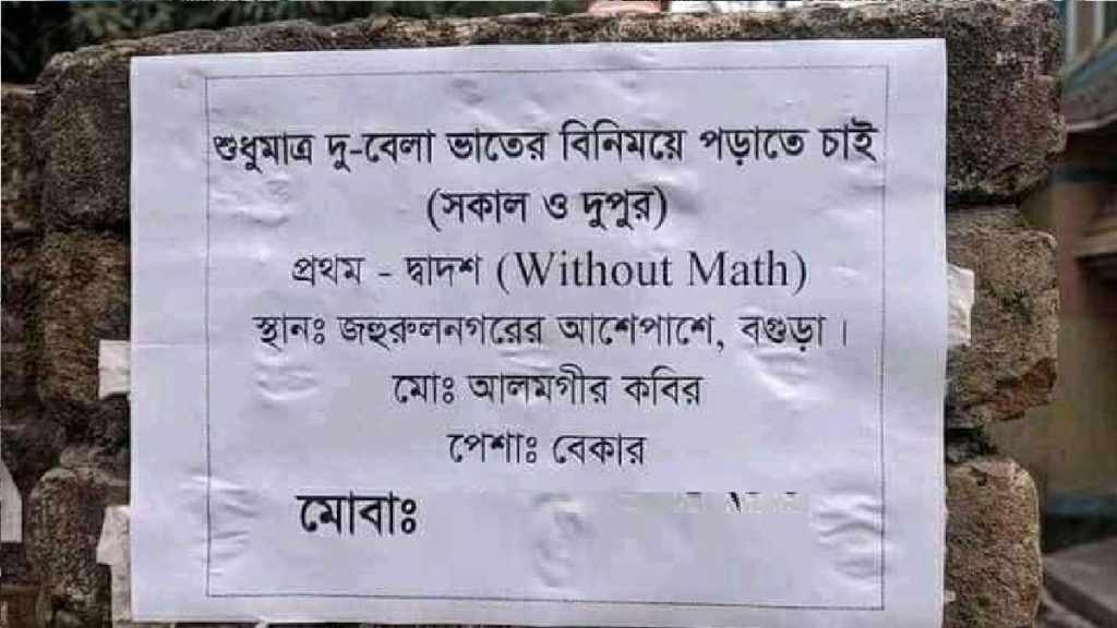 আলমগীর কবির তার পোস্টারে লিখেছেন, ‘শুধুমাত্র দু-বেলা ভাতের বিনিময়ে পড়াতে চাই।’ এ ছাড়া তিনি লিখেছেন, বগুড়ার জহুরুলনগরের আশেপাশে সকাল ও দুপুরে প্রথম থেকে দ্বাদশ শ্রেণি পর্যন্ত গণিত ব্যতীত সবকিছুই পড়াবেন। সেই পোস্টারে নিজের পেশা হিসেবে লিখেছেন ‘বেকার’। এতে তার নাম ও মোবাইল নাম্বার দেয়া আছে।