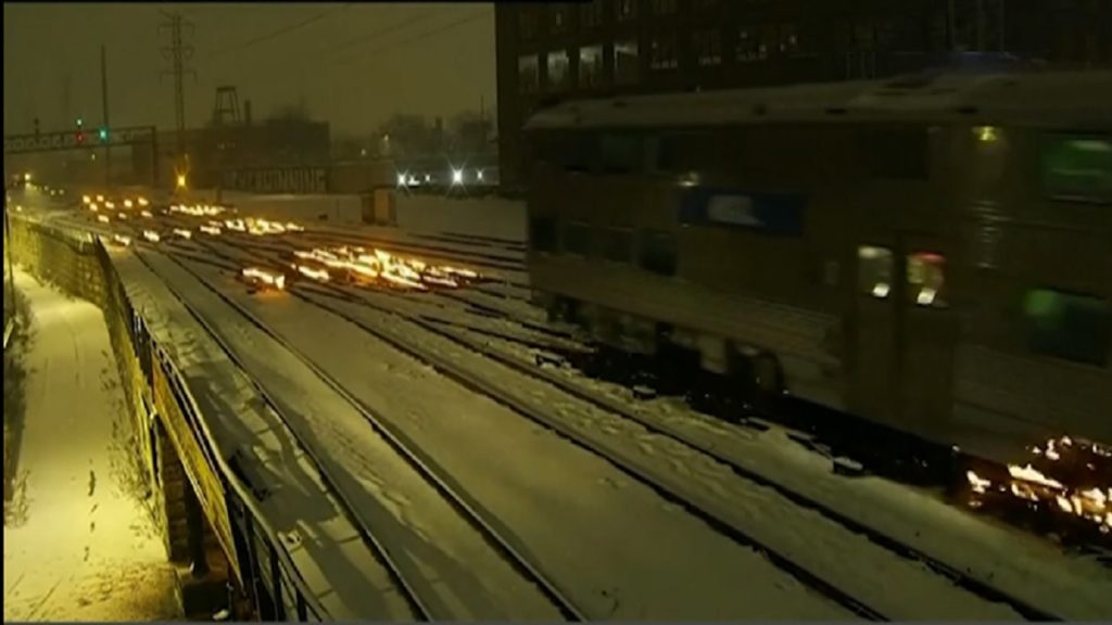 শিকাগোর রেললাইনে জ্বলছে আগুন। তীব্র ঠাণ্ডায় দুর্ঘটনা এড়াতে এ পদ্ধতি ব্যবহৃত হয় যুক্তরাষ্ট্রের শিকাগোয়।