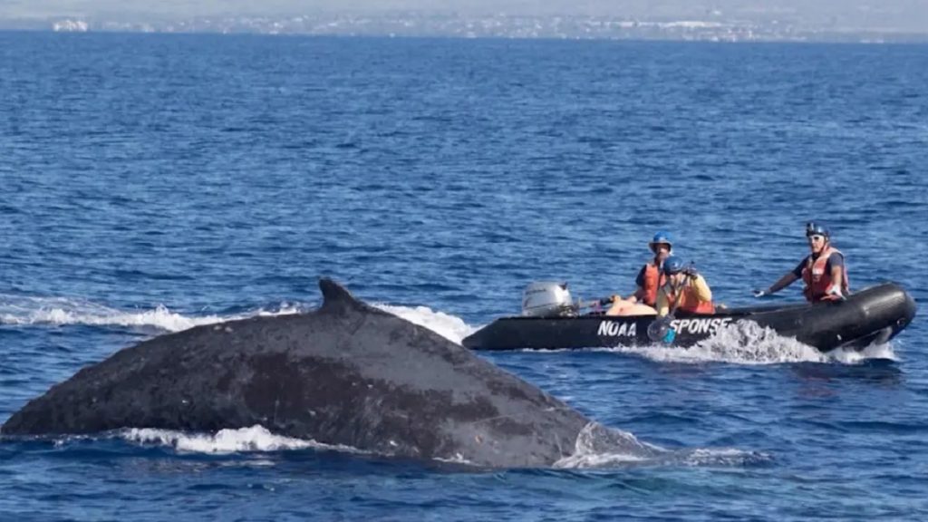 জাতীয় সমুদ্র এবং পরিবেশ বিষয়ক প্রশাসন জানায়, ১৪০ ফুট লম্বা শিকারের দড়িতে আটকে যায় প্রাণীটির লেজ। তাছাড়া, প্লাস্টিকের একটি বয়ায় আটকা ছিল তিমির পাখনা। কয়েক ঘণ্টার চেষ্টায় সেগুলো ছাঁড়ানো গেলেও কেটে যায় মাছটির চামড়া। অফিসিয়ালরা জানিয়েছে, এখন ভালো অবস্থায় আছে তিমিটি। তবে শিকারের দড়ির ওজন বেশি হওয়ায় তা তিমির মাংস কেটে বসে গিয়েছিল। শিকারের দড়ির মালিকানা কার, তা জানতে চলছে অনুসন্ধান।