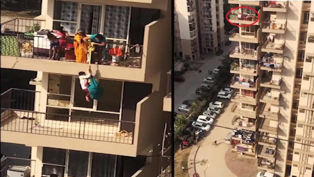 বারান্দায় রোদে শুকাতে দেয়া একটি শাড়ি পড়ে গিয়েছিল নিচে। ১০তলা থেকে উড়ে গিয়ে পড়েছিল ৯তলার ফ্ল্যাটের বারান্দায়। আর সেই পোশাক উদ্ধার করতে ১০তলার ফ্ল্যাটের বাসিন্দা এক নারী তার ছোট্ট ছেলেকে নিচে পাঠান অভিনব উপায়ে। বাচ্চাটির কোমরে হলুদ রঙের একটি বিছানার চাদর বেঁধে চাদরটিকে দড়ির মতো ব্যবহার করে, শিশুটিকে ঝুলিয়ে বারান্দা দিয়ে নামান নিচে।