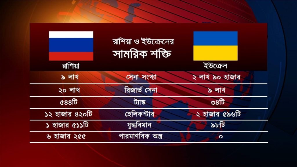 খাতা-কলমে সামরিক শক্তিতে রাশিয়ার সাথে যোজন-যোজন পার্থক্য ইউক্রেনের। শুধু সেনার সংখ্যাই নয়, ট্যাঙ্ক, আর্টিলারি, সাঁজোয়া যান, সবকিছুতেই অনেক এগিয়ে রুশরা।