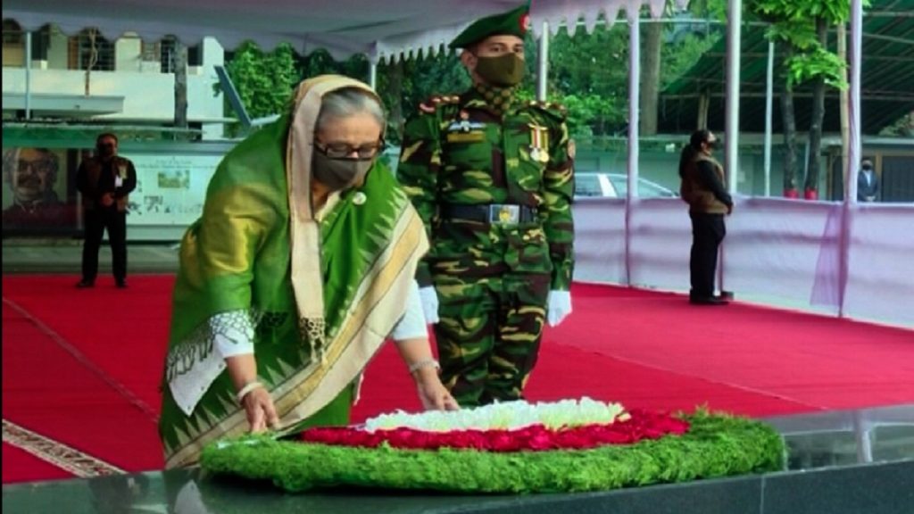 ঐতিহাসিক ৭ মার্চ উপলক্ষে বঙ্গবন্ধু শেখ মুজিবুর রহমানের প্রতিকৃতিতে ফুল দিয়ে শ্রদ্ধা নিবেদন করেছেন প্রধানমন্ত্রী শেখ হাসিনা।