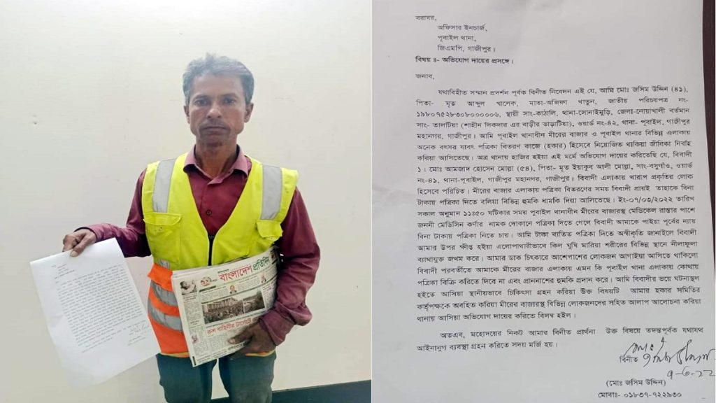 ভুক্তভোগী জসিম জানায়, দীর্ঘদিন যাবত পুবাইল এলাকায় পত্রিকা বিতরণ করার সময় বিনামূল্যে পত্রিকা দাবী করেন আওয়ামী লীগ নেতা আমজাদ হোসেন মোল্লা। সোমবার সকালে অন্যান্য দিনের মতো বিনামূল্যে পত্রিকা দিতে অস্বীকৃতি জানালে আমাকে এলোপাথাড়ি মারধর করতে থাকেন ওই আওয়ামী লীগ নেতা। এসময় তিনি পুবাইল এলাকায় আমাকে থাকতে দেবেন না বলে প্রাণনাশের হুমকি দেন।