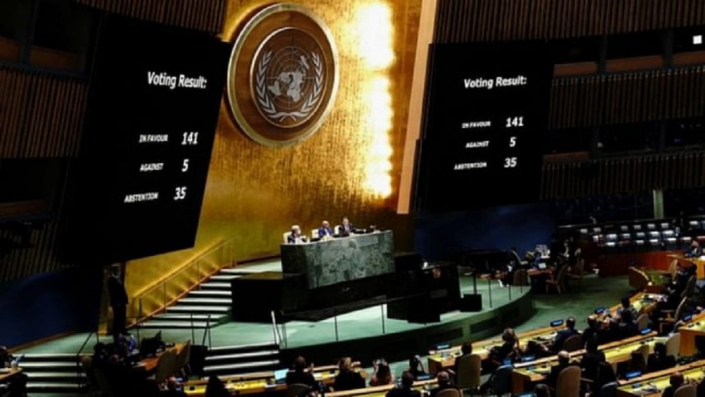 প্রতিবেশী দেশ ইউক্রেনে রাশিয়ার সামরিক হামলা বন্ধ ও সেখান থেকে রুশ সেনাদের সরিয়ে নিতে গত বুধবার জাতিসংঘের সাধারণ পরিষদে সংখ্যাগরিষ্ঠ দেশের সমর্থনে একটি প্রস্তাব পাস হলেও, ওই প্রস্তাবে ভোটদানে বিরত ছিল বাংলাদেশ। ইউক্রেনে সামরিক অভিযানের প্রতিবাদে জাতিসংঘ সাধারণ পরিষদের ডাকা জরুরি অধিবেশনে পাস হওয়া ওই প্রস্তাবে ১৯৩টি সদস্য দেশের মধ্যে ১৪১টি দেশ প্রস্তাবের পক্ষে ভোট দেয়।
