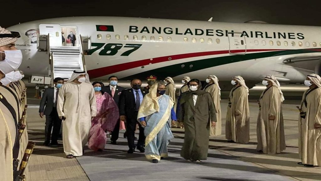 পাঁচ দিনের সরকারি সফরে সংযুক্ত আরব আমিরাতে পৌঁছেছেন প্রধানমন্ত্রী শেখ হাসিনা। পৌঁছানোর পর বিমানবন্দরে প্রধানমন্ত্রী শেখ হাসিনাকে লাল গালিচা সংবর্ধনা দেয়া হয় এবং ২১ সদস্যের একটি চৌকস দল তাকে গার্ড অব অনার প্রদান করে।