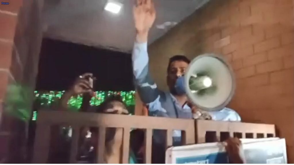 এক পর্যায়ে ওসি (তদন্ত) মহসীন হোসেন তার হ্যান্ডমাইক তুলে দেন রিমান্ডের আসামি চেয়ারম্যান শফিকুল ইসলাম শিমুলের হাতে। তিনি পুলিশ বক্সে দাঁড়িয়ে কর্মী-সমর্থকদের উদ্দেশে হাত নেড়ে শুভেচ্ছা জানান। সেই সময় তার হাতে ছিল না কোনো হ্যান্ডকাফ। তিনি নিজেকে নির্দোষ দাবি করে হ্যান্ড মাইকে বক্তব্য দেন।