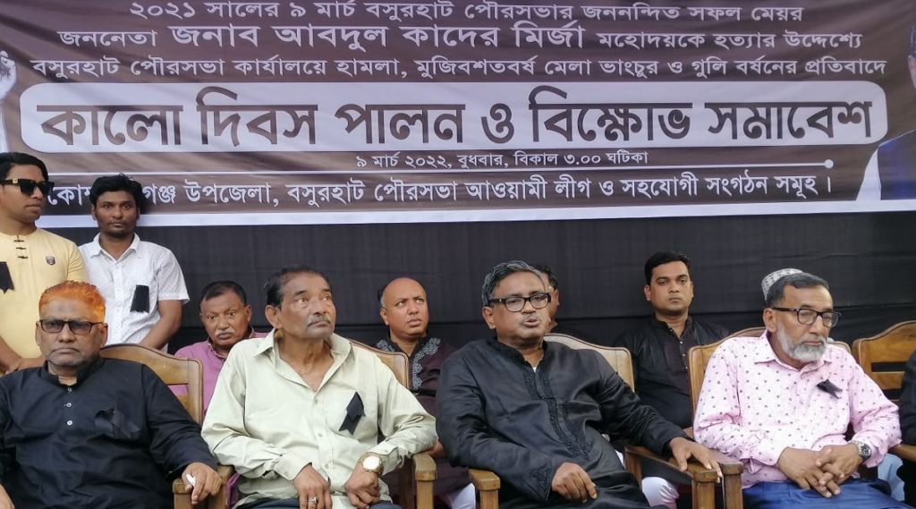 নোয়াখালীর বসুরহাট পৌরসভার মেয়র আব্দুল কাদের মির্জাকে হত্যার উদ্দেশ্যে বসুরহাট পৌরসভা কার্যালয়ে হামলা, গুলিবর্ষণ, মুজিব শতবর্ষ মেলা ভাঙচুর এবং সিএনজি চালক আলা উদ্দিন হত্যার এক বছর উপলক্ষ্যে কালো দিবস পালন, বিক্ষোভ মিছিল ও সমাবেশ করেছে কোম্পানীগঞ্জ উপজেলা ও বসুরহাট পৌরসভা আওয়ামী লীগ ও সহযোগী সংগঠন।
