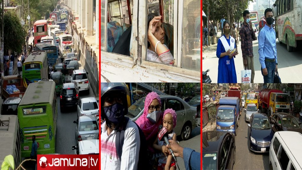 মঙ্গলবার সকাল থেকেই থেমে থেমে চলছিল যানবহন। দুপুরের দিকে যখন কিছুটা খালি হওয়ার কথা ঠিক তখনই আরও উদ্ভট চেহারা নিয়ে উদয় হয় যানজট। দুপুর সাড়ে ১২ টা থেকে পৌনে ৩ টা পর্যন্ত স্তব্ধ ছিল রাজধানীর সড়ক, অলি-গলি, লেন সবকিছু। বেলা যত বেড়েছে তীব্র তাপদাহের সাথে পাল্লা দিয়ে বেড়েছে অসহনীয় যানজট। যানজটে নাকাল নারী-শিশু-বৃদ্ধরা ছিলেন এক শ্বাসরুদ্ধকর অবস্থায়। রাজধানীর পুরান ঢাকার লক্ষ্মীবাজার, রায় সাহেব বাজার, পল্টন, মতিঝিল, বেইলী রোড, বাড্ডা, রামপুরা এবং নতুন বাজার এলাকায় ছিল তীব্র যানজট। সেই সাথে নগরীর প্রাণকেন্দ্র ফার্মগেট, মোহাম্মদপুর, ধানমন্ডিসহ আশপাশের প্রায় সব এলাকাই যেন আটকে ছিল তীব্র যানজটে।