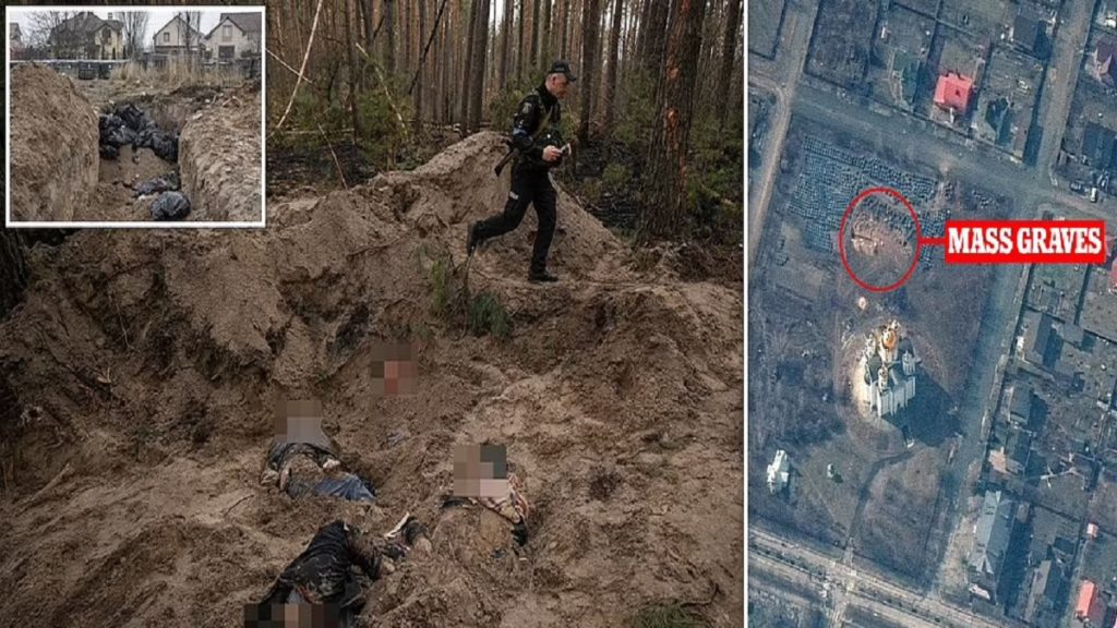 স্যাটেলাইট ইমেজে গত ৩১ মার্চ দেখা যায় একটি চিত্র; বুচা শহরের সেন্ট অ্যান্ড্রু চার্চের পেছনে ঘাস আচ্ছাদিত স্থানে ৪৫ ফুট লম্বা এই গণকবরে প্রায় ৪১০ জন বেসামরিক মানুষের লাশ রয়েছে বলে জানায় ইউক্রেনের সশস্ত্র বাহিনী। রুশদের বর্বর আচরণের চিহ্ন এখানে স্পষ্টভাবে প্রতীয়মান হয়েছে বলে জানায় ডেইলি মেইল। বেশ কিছু লাশের দুই হাত বাঁধা ছিল পিছমোড়া করে, আবার কয়েকটি লাশে পাওয়া গেছে নির্যাতন ও ধর্ষণের চিহ্ন।