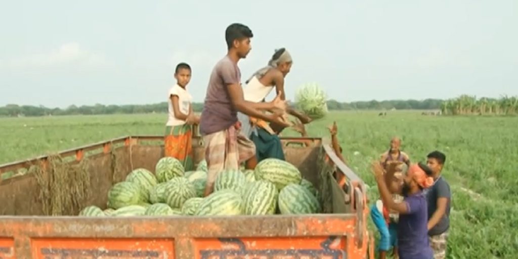 ভোলার চরফ্যাশনে বাম্পার ফলন হয়েছে তরমুজের, মিলছে ভালো দামও। উৎপাদন খরচ মিলিয়ে চাষিরা দাম নির্ধারণ করেন। পাইকারদের সাথে চলে দর কষাকষি। এরপর মাঠ থেকে কিনে আনা হয় আড়তে। অন্যদিকে দক্ষিণাঞ্চলের বিভিন্ন জেলা থেকে তরমুজ নৌপথে প্রতিনিয়ত আসছে মুন্সিগঞ্জে ধলেশ্বরী নদীপাড়ে মুক্তারপুর হাটে। এই হাটে বেড়েই চলেছে দাম। বিক্রি হচ্ছে পিস হিসেবে। মুক্তারপুর হাটের তরমুজ চলে যাচ্ছে নারায়ণগঞ্জ, ঢাকা, নরসিংদীসহ দেশের বিভিন্ন স্থানে। সেখানে দাম আরও চড়া।