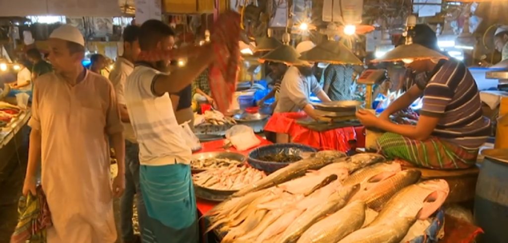 কারওয়ানবাজারে রুই-কাতল বিকোচ্ছে ২৫০-৩০০ টাকা কেজি দরে। ১০০ টাকার আশপাশে ওঠানামা করছে তেলাপিয়ার দাম। আকারভেদে ইলিশের কেজি ৯০০ থেকে ১২০০ টাকা। তবে দামি মাছের কদর কমেছে। ৬০০ টাকায় নেমেছে বড় চিংড়ির কেজি। অর্ধেক দরে মিলছে বড় আইড় আর বোয়াল।
