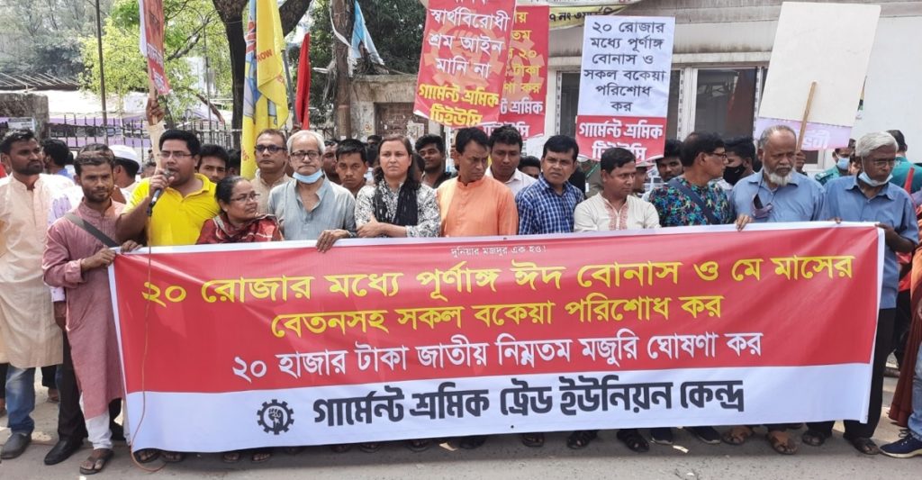 ২০ রোজার মধ্যে পূর্ণাঙ্গ ঈদ বোনাস ও মে মাসের বেতনসহ সকল বকেয়া পরিশোধের দাবি জানিয়েছে গার্মেন্টস শ্রমিক ট্রেড ইউনিয়ন কেন্দ্র।