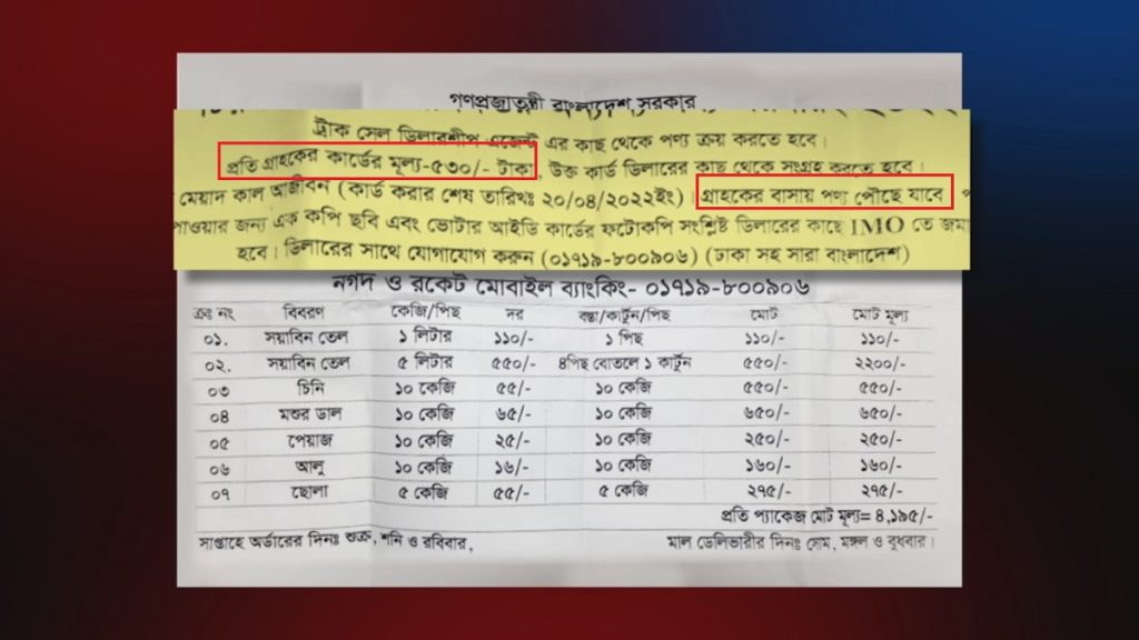 সরাসরি ডিলারের কাছ থেকে হোম ডেলিভারি পাওয়া যাবে টিসিবির নিত্যপণ্য। শুধু তাই নয় একটি সিরিয়াল নম্বরের সাহায্যে আজীবনই স্বল্পমূল্যে পাওয়া যাবে এসব পণ্য। দুর্মূল্যের বাজারে এমনই চটকদার কথায় সাজানো লিফলেটের মাধ্যমে অভিনব প্রতারণার জাল পেতেছেন এক ব্যক্তি। যদিও টিসিবি বলছে, সরাসরি ট্রাক ছাড়া অন্য কোথাও থেকে তাদের পণ্য কেনার সুযোগ নেই।