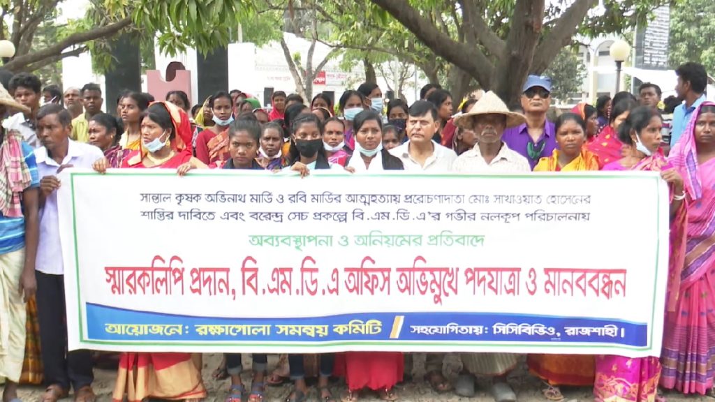 রাজশাহীতে সেচের পানি না পেয়ে আত্মহত্যাকারী দুই কৃষকের মৃত্যুর ঘটনায় অভিযুক্তের শাস্তি, গভীর নলকূপ পরিচালনায় অব্যবস্থাপনা এবং অনিয়মের প্রতিবাদে আন্দোলন করেছে ক্ষুদ্র নৃগোষ্ঠীর বাসিন্দারা।