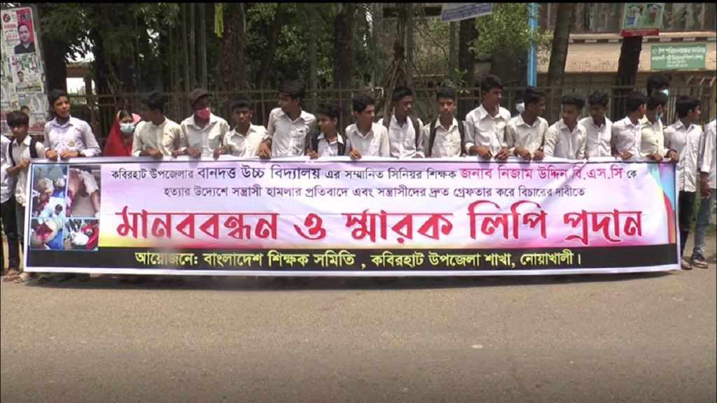 নোয়াখালীর কবিরহাট উপজেলার বানদত্ত উচ্চ বিদ্যালয়ের বিজ্ঞান শিক্ষক নিজাম উদ্দিন বিএসসিকে কুপিয়ে আহত করার প্রতিবাদ ও জড়িতদের গ্রেফতারের দাবিতে বিক্ষোভ ও মানববন্ধন হয়েছে।