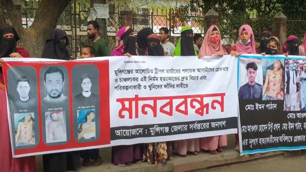 মুন্সীগঞ্জের আলোচিত ট্রিপল হত্যা মামলার আসামিদের গ্রেফতার ও বিচারের দাবিতে মানববন্ধন করেছেন নিহতদের স্বজন ও এলাকাবাসী। মঙ্গলবার (১২ এপ্রিল) সকাল ১১টায় জেলা আইনজীবী সমিতির সামনে কাটাখালী-মুন্সীগঞ্জ সড়কে এ মানববন্ধন করা হয়।