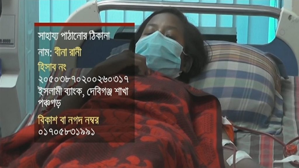বীনাকে সাহায্য পাঠানোর ঠিকানা: বীনা রানী, হিসাব নং- ২০৫০৩৮৭০২০০২৬০৩১৭, ইসলামী ব্যাংক, দেবিগঞ্জ শাখা, পঞ্চগড়। বিকাশ ও নগদ নম্বর: ০১৭০৫৮৩১৯৯১।