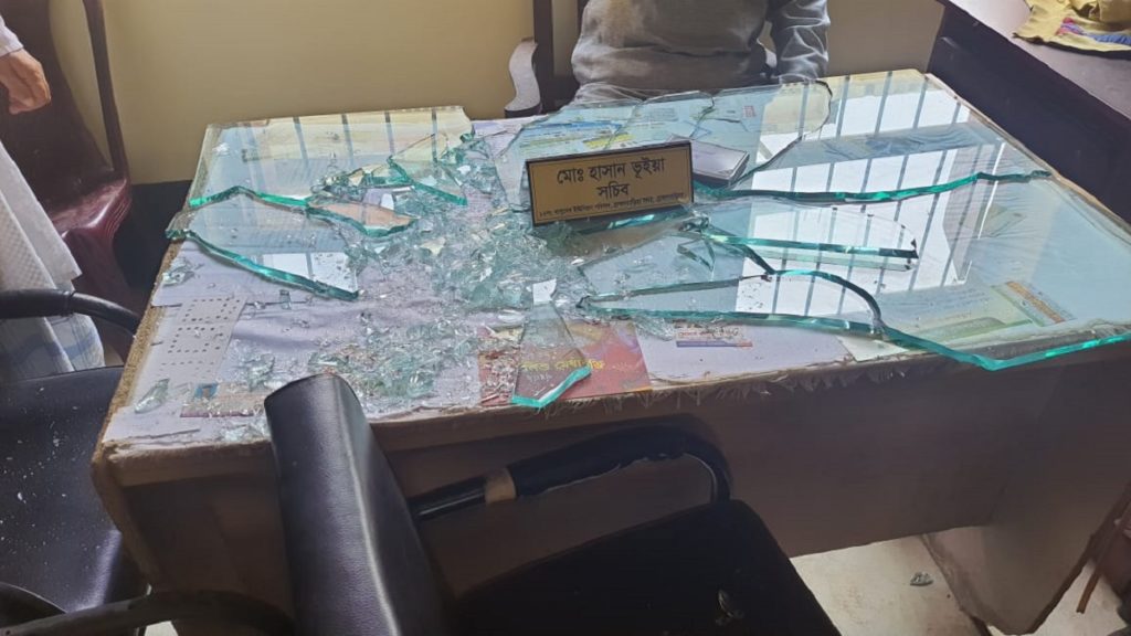 রোববার দুপুর ১২টার দিকে নাজির ভূইয়া হাতে বাশ ও মাথায় হেলমেট পরে চেয়ারম্যানের কক্ষে ঢুকে টেবিল চেয়ার ভাঙচুর করেন। চেয়ারম্যানের কক্ষে ভাঙচুর চালিয়ে ইউপি সচিবের কক্ষে ঢুকে টেবিল ও উদ্যোক্তার কক্ষে ঢুকে দুইটি কম্পিউটার লাঠি দিয়ে ভেঙে ফেলেন।