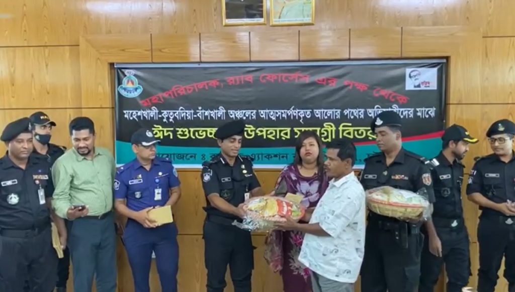 কক্সবাজারের মহেশখালী-কুতুবদিয়া-বাঁশখালী এবং পেকুয়া উপকূলীয় এলাকার আত্মসমর্পণকৃত ৭৭ জনের মাঝে ঈদ শুভেচ্ছা ও উপহার সামগ্রী বিতরণ করেছেন র্যাব।
