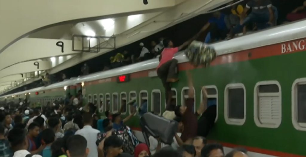 পঞ্চগড় এক্সপ্রেসের ঢাকা ছেড়ে যাওয়ার কথা রাত ১০টা ৪৫ মিনিটে। কিন্তু রাত ১২টা পেরিয়ে গেলেও ঢাকায় পৌঁছায়নি ট্রেনটি। তাই শত শত মানুষের অপেক্ষা করতে হয় দীর্ঘক্ষণ। প্রায় দু’ঘণ্টা পর ট্রেন আসতেই হুমড়ি খেয়ে পড়ে অধৈর্য যাত্রীরা। যে যার মতো করে উঠতে শুরু করে ট্রেনে। মানুষের চাপে দরজা দিয়ে প্রবেশের সুযোগ নেই। অগত্যা ট্রেনের ছাদে ওঠেন অগণিত মানুষ। কেউ কেউ ওঠেন জানালা দিয়ে।