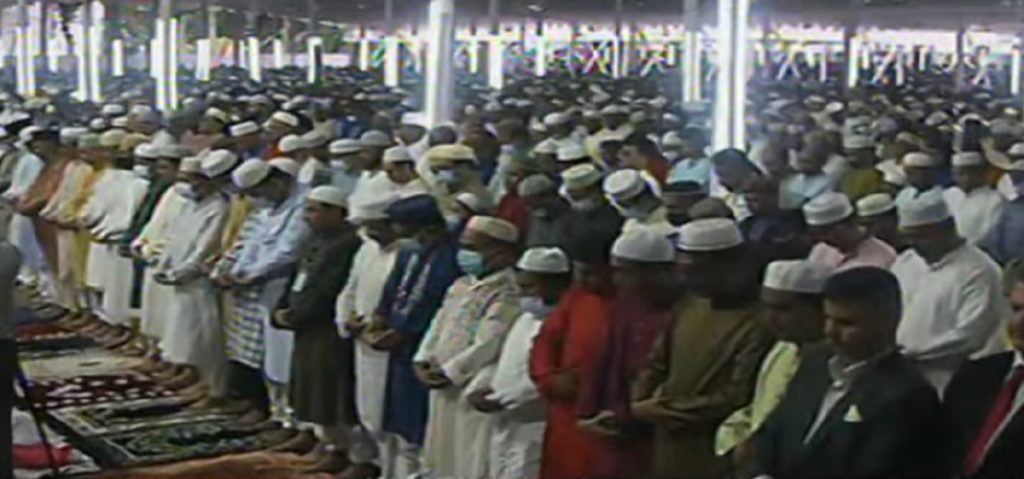 আজ পবিত্র ঈদুল ফিতর। পূর্বনির্ধারিত সময় অনুযায়ী সকাল ৮টায় রাজধানীর হাইকোর্ট প্রাঙ্গণে জাতীয় ঈদগাহে শুরু হয়েছে ঈদের প্রধান জামাত। সেখানে অংশ নিয়েছেন শতাধিক মুসল্লি। সকলেই এক যোগে ঈদের নামাজ আদায় করছেন, প্রার্থনা করছেন দেশ, জাতি ও প্রিয়জনদের জন্য।