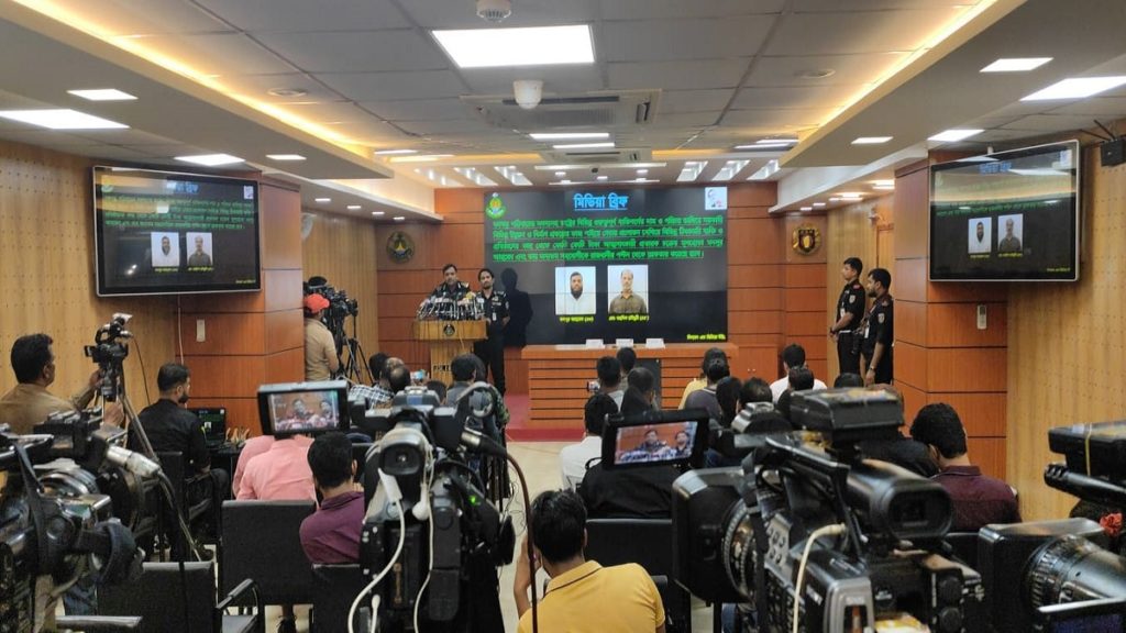 সংবাদ সম্মেলনে কথা বলছেন র্যাবের মুখপাত্র কমান্ডার খন্দকার আল মঈন।