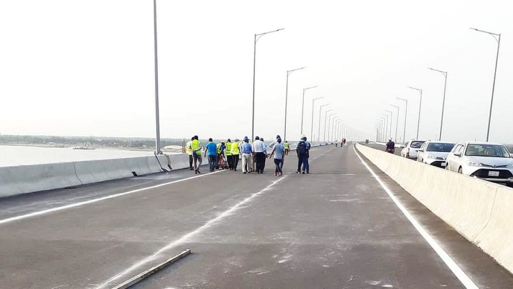 পদ্মা সেতুতে রোড মার্কিংয়ের কাজ পরিদর্শন করছেন কর্মকর্তারা।