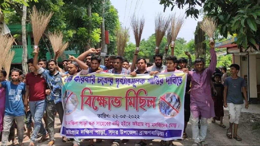 রোববার (২২ মে) দুপুরে সদর উপজেলার তালশহর পূর্ব ইউনিয়নের অষ্টগ্রামে স্থানীয় দক্ষিণপাড়া এলাকাবাসীর উদ্যোগে এ ঝাড়ু মিছিল অনুষ্ঠিত হয়। মিছিলটি দক্ষিণপাড়া হকবাড়ি থেকে বের হয়ে সদর-আশুগঞ্জ সড়ক প্রদক্ষিণ করে। এরপর অষ্টগ্রাম মসজিদের সামনে সমাপনী সমাবেশ করেন বিক্ষুব্ধরা।