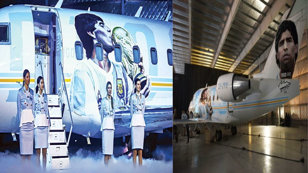 ট্যাঙ্গো ডি ১০ এস মডেলের বিশেষ বিমানটির উদ্বোধন হয়েছে আর্জেন্টিনার রাজধানী বুয়েন্স আয়ার্সের মোরন বিমানবন্দরে। তৈরি করেছে দেশটির ‘গিভ অ্যান্ড গেট’ গ্রুপ। যে বিমানে দেখানো হবে ম্যারাডোনার ব্যবহার করা জার্সি ও বুট।