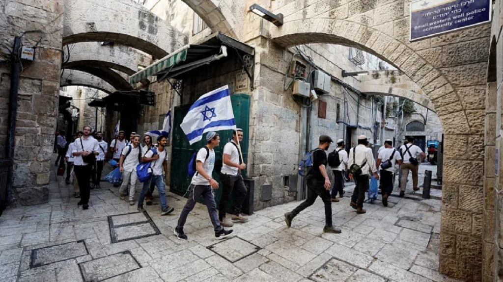 রোববার তথাকথিত ফ্ল্যাগ মার্চ (জেরুজালেমে পূর্ণ নিয়ন্ত্রণ প্রতিষ্ঠার বার্ষিকীতে প্রতিবছর পতাকা মিছিল করেন ইহুদিরা)-এর অজুহাতে বুনো উল্লাসে মেতে ওঠে জায়নবাদীরা। হাজার-হাজার কট্টরপন্থী ইহুদি প্রবেশ করে পবিত্র আল-আকসা প্রাঙ্গনে। এর প্রতিবাদ জানাতে গেলে, ফিলিস্তিনিদের ওপর চড়াও হয় ইসরায়েলি সেনাবাহিনী। মুহূর্তেই রণক্ষেত্রে পরিণত হয় গোটা এলাকা। আহত হন অর্ধ-শতাধিক ফিলিস্তিনি। খবর আল জাজিরার।