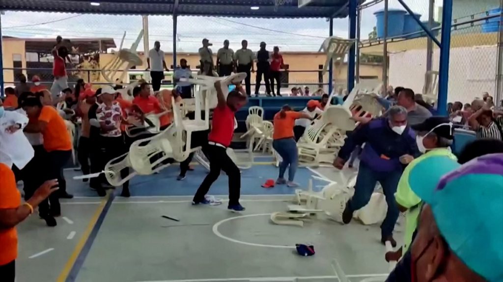 ভেনেজুয়েলায় এক রাজনৈতিক কর্মসূচিকে ঘিরে তুলকালাম কাণ্ড হয়েছে দুই দলের মধ্যে। আলজাজিরার খবরে বলা হয়, সরকারি ও বিরোধী দলের সদস্যরা হাতাহাতিতে লিপ্ত হয়, এমনকি চেয়ার ছোঁড়াছুড়িও করেন তারা।