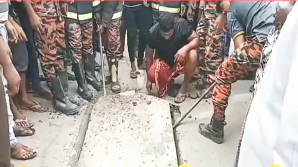 কিন্তু ড্রেনের ওপরের অংশ ঢালাই করা থাকায় নামার কোনো পথ পাচ্ছিলেন না ফায়ার সার্ভিস কর্মীরা। পরে একটি দোকানের সামনের অংশ কেটে উদ্ধারকারী দল ভেতরে নেমে তিন শিশুকে উদ্ধার করে।