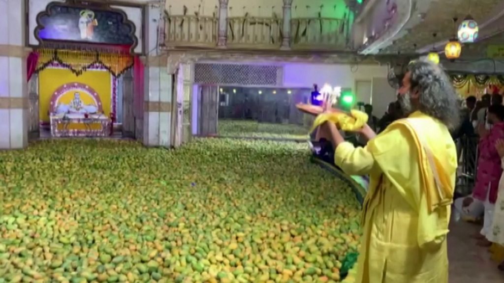 গুজরাটে শ্রীকৃষ্ণের পূজা অনুষ্ঠিত হয়েছে বিভিন্নজাতের সোয়া লাখ আম দিয়ে।
