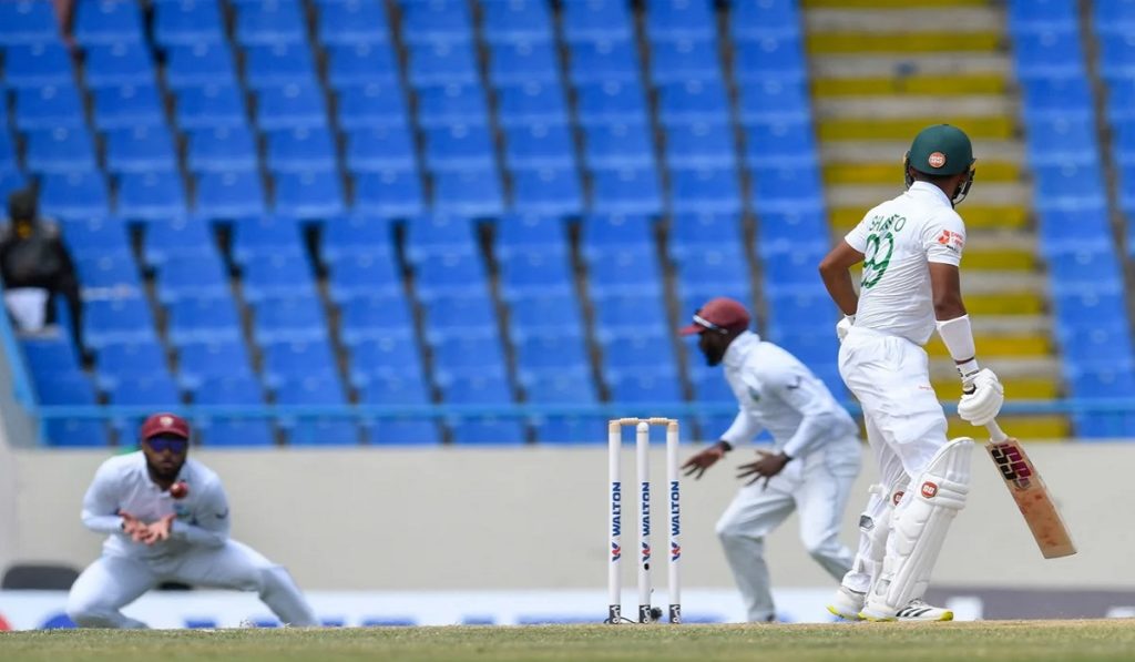 এর আগে, প্রথম ইনিংসে সফররতদের করা ১০৩ রানের জবাবে ক্যারিবীয়দের ইনিংস থামে ২৬৫ রানে। ১৬২ রানে পিছিয়ে থেকে নিজেদের ২য় ইনিংসে ব্যাট করতে নেমে তামিম-মিরাজের উইকেট হারিয়ে ৫০ রান করে দ্বিতীয় দিন শেষ করেছিল বাংলাদেশ।