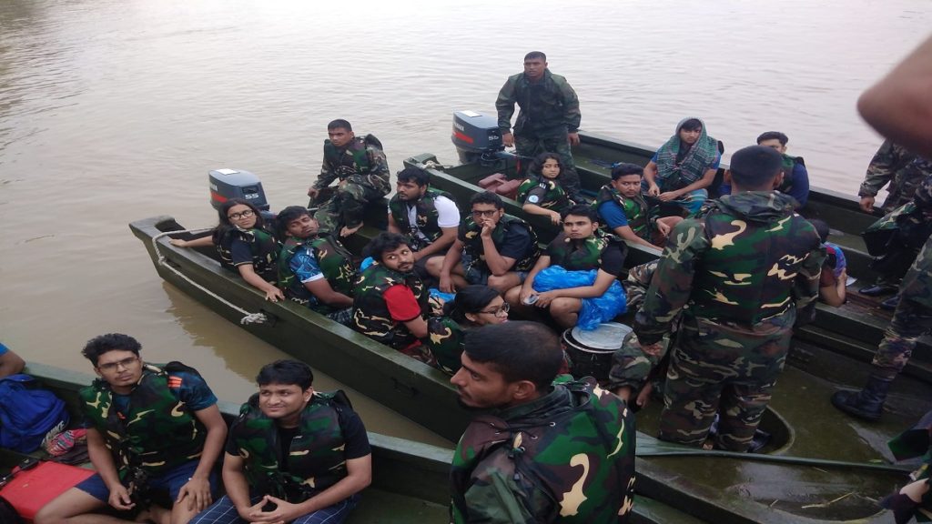 বন্যার কারণে সুরমা নদীর চরে আটকে পড়া ঢাকা বিশ্ববিদ্যালয়ের ২১ শিক্ষার্থী বাংলাদেশ সেনাবাহিনীর সহায়তায় গাড়িতে করে সিলেটের উদ্দেশে রওনা দিয়েছে। এদের মধ্যে একজন ঢাবির গণযোগাযোগ ও সাংবাদিকতা বিভাগের শিক্ষার্থী মো. শোয়াইব আহমেদ। সামাজিক যোগাযোগমাধ্যম ফেসবুকে ছবিসহ স্ট্যাটাস দিয়ে তিনি লিখেছেন, আমরা নিরাপদে আছি, সুস্থ আছি। বাংলাদেশ আর্মির সহায়তায় আমরা সিলেটে গাড়িযোগে পৌঁছাচ্ছি। আলহামদুলিল্লাহ।